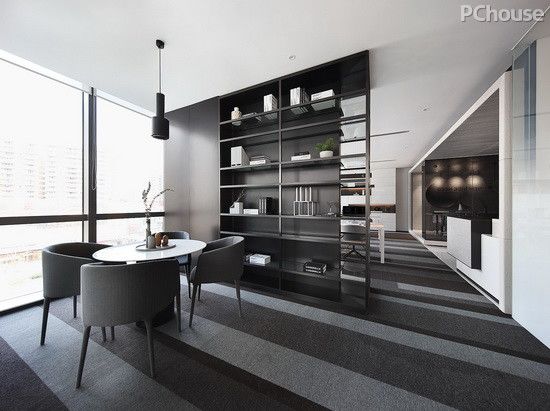 既然在設(shè)計(jì)本身的層面沒(méi)有硬性要求,設(shè)計(jì)師便在第一種情境中嘗試著玩一種黑白灰關(guān)系的像素視覺(jué),而將小一點(diǎn)的空間想象成一個(gè)小型的文創(chuàng)行業(yè)的辦公地。