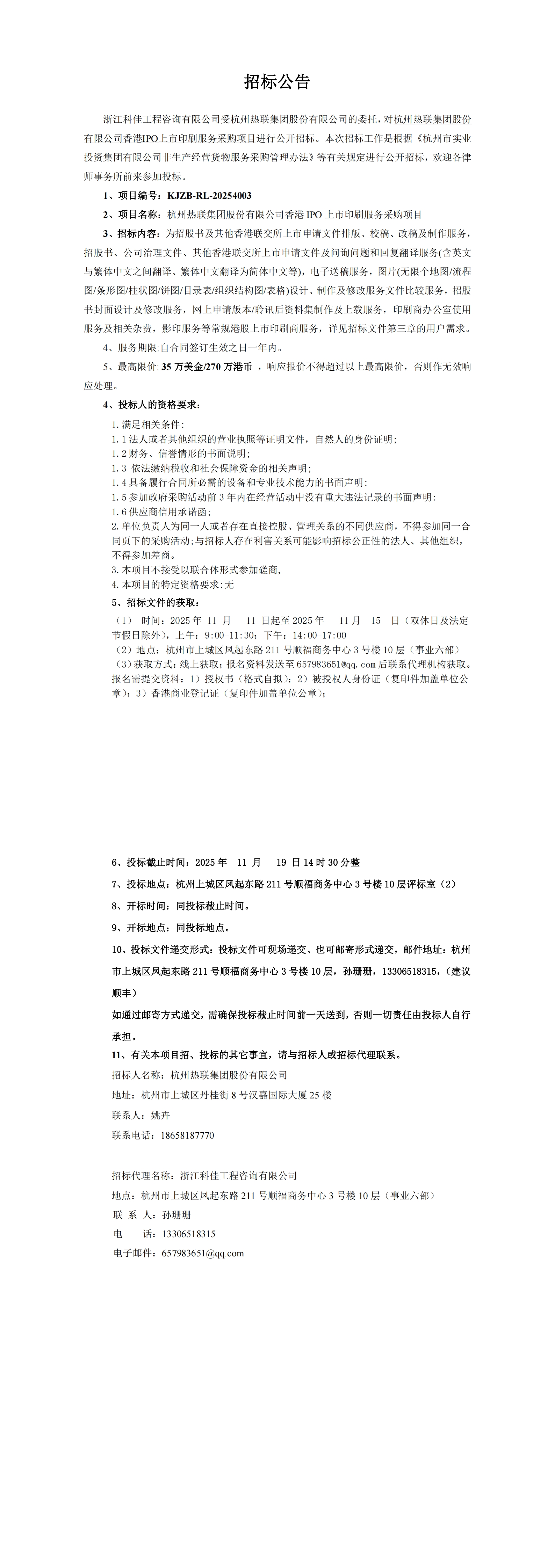 關于杭州熱聯集團股份有限公司香港IPO上市印刷服務采購項目的招標公告